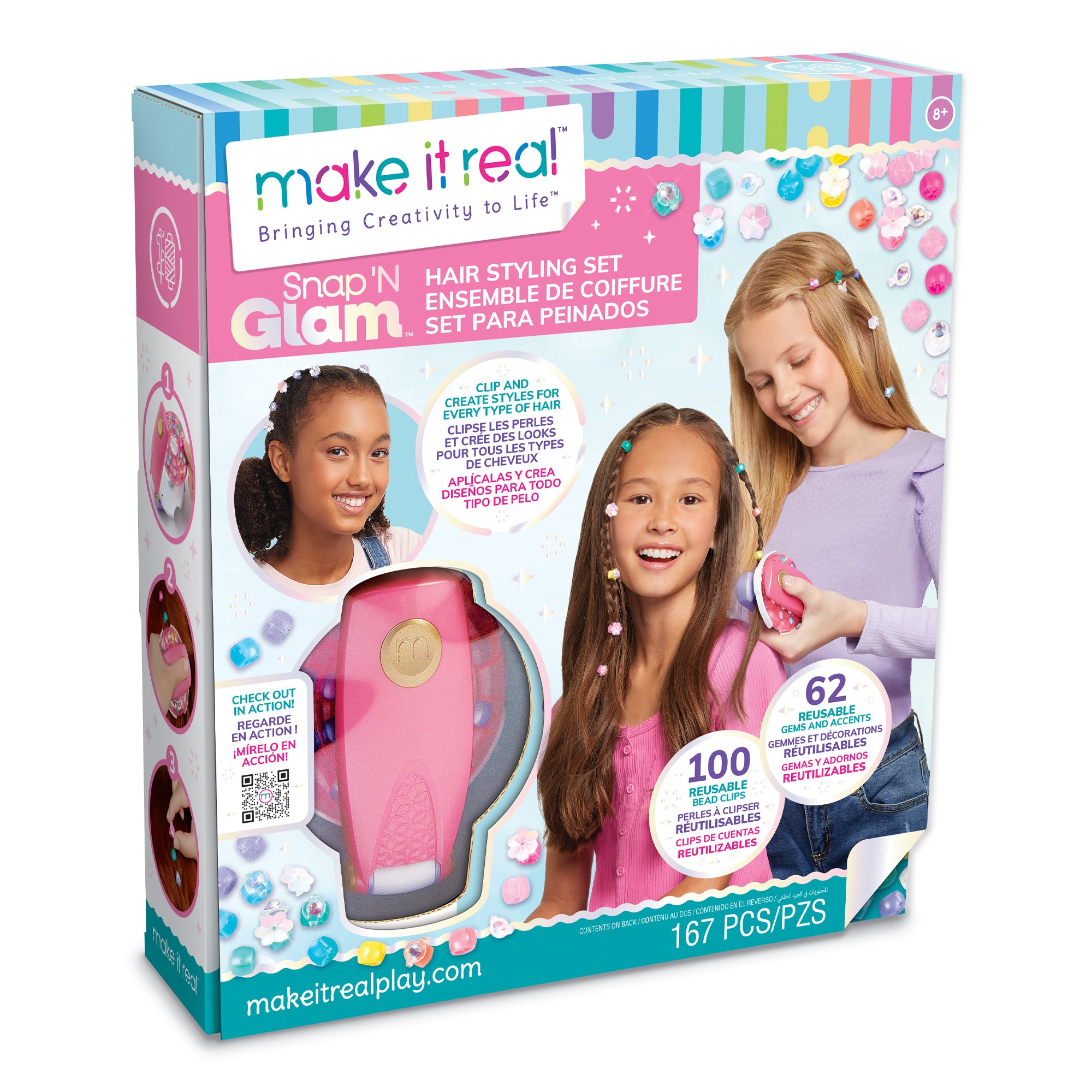 Clip and create styles for every type of hair! Using the included 100 bead clips with butterfly, gem, and flower accents, young fashionistas can create looks that express their unique styles in three simple steps: load, clip, style! Load the cartridge with the desired bead clips, then clip onto hair with ease. All bead clips and accents are simple to remove and reusable. Includes a measuring tool to ensure easy application. Use as accents or to connect locks of hair together for more elaborate styles!