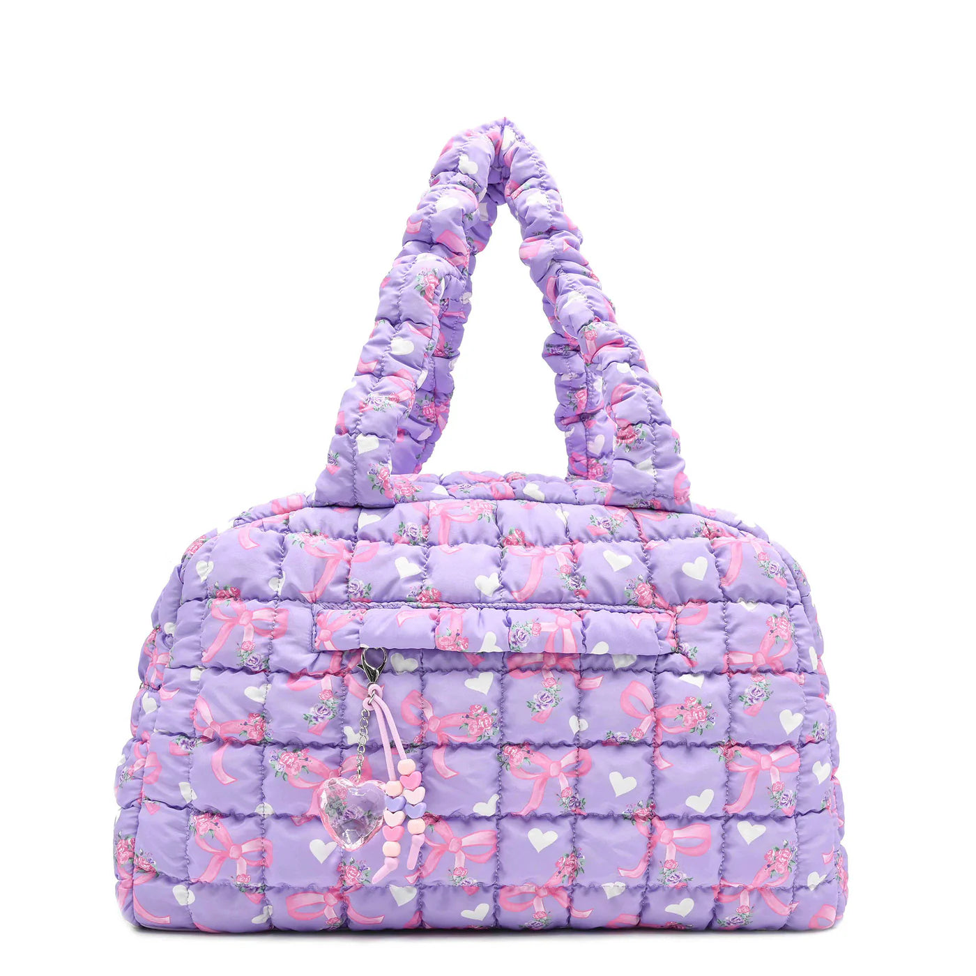 A girly girl's dream! Where style meets versatility, our favorite duffle bag silhouette gets a charming upgrade! For their extra curriculars, to the gym, dance class, weekend getaways, and everywhere else in between - they'll be carrying it all in our new nylon quilted lavender bow printed medium duffle with a zipper closure front pocket.