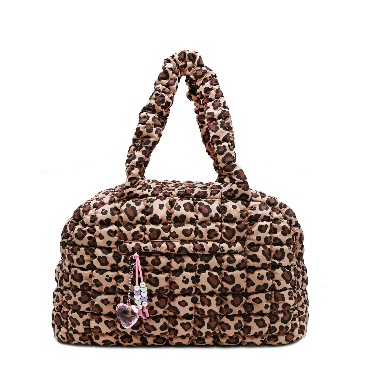 Unleash their wildly stylish side with our quilted scrunchies medium duffle bag in our all new leopard print! Light-weight and roomy - detailed with a beaded heart bag charm puller front pouch, hot pink zipper, and puffed shoulder straps for comfortable toting!